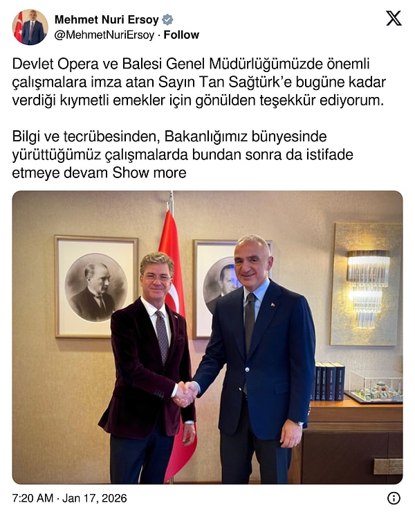 ‘Devlet Opera ve Balesi Genel Müdürlüğümüzde kıymetli çalışmalara imza atan Sayın Tan Sağtürk’e bugüne kadar verdiği değerli emekler için gönülden teşekkür ediyorum.